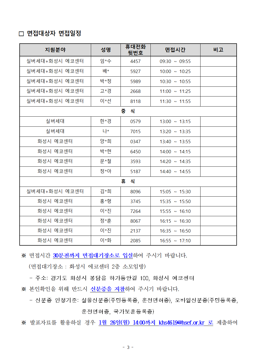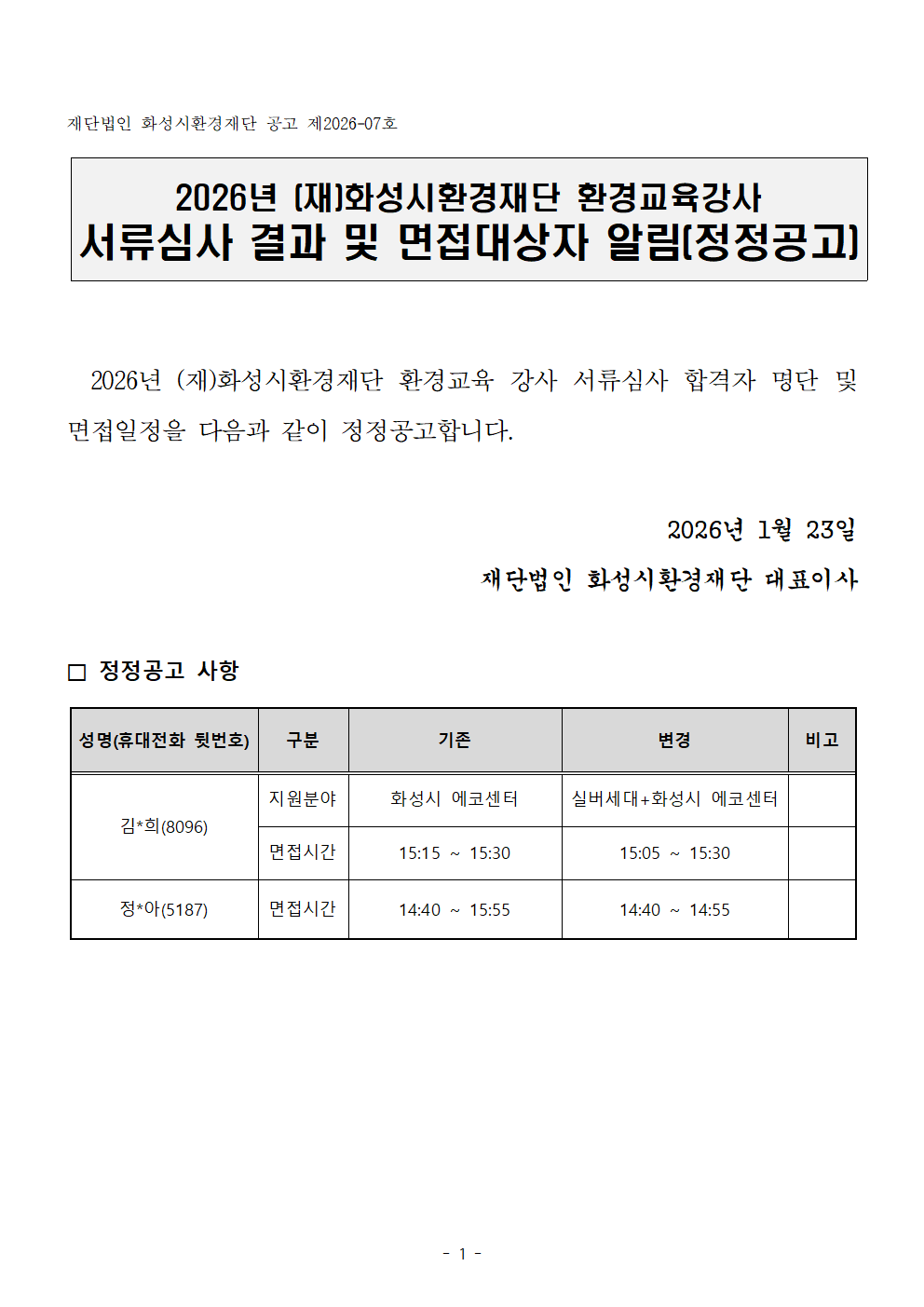 2026년 (재)화성시환경재단 서류심사 결과 및 면접대상자 알림(정정공고)