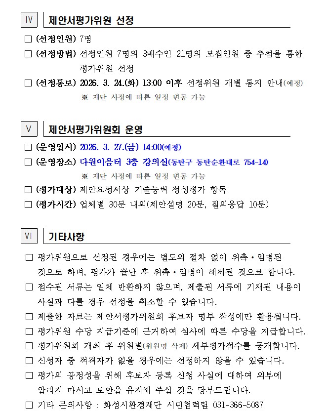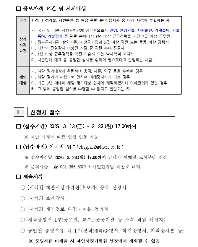 [서식 1] 제안서평가위원회(후보자) 등록 신청서 [서식 2] 보안각서 [서식 3] 개인정보 수집 이용 동의서 * 하기 일정은 재단 상황에 따라 변동될 수 있습니다. □ 제안서평가위원회 모집 ○ 모집기간 : 2026. 3. 13.(금) ~ 3. 23.(월) 17:00 ○ 모집인원 : 총 21명 ○ 접수방법 : 이메일 제출(cksgh12@hsef.or.kr) ○ 문의사항 : ☎ 031-366-5087 □ 제안서평가위원회 개최 ○ 개최일시 : 2026. 3. 27.(금) 14:00 예정 ○ 개최장소 : 동탄구 다원이음터(동탄순환대로 754-14)