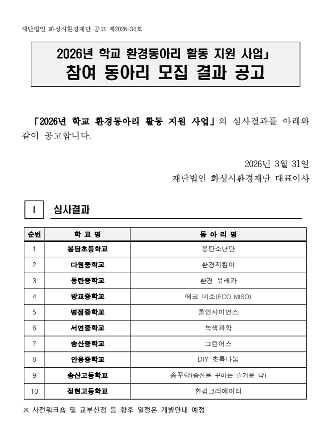 [공고문] 2026년 학교 환경동아리 활동 지원 사업 모집 결과 공고.pdf [43.8 KB]
