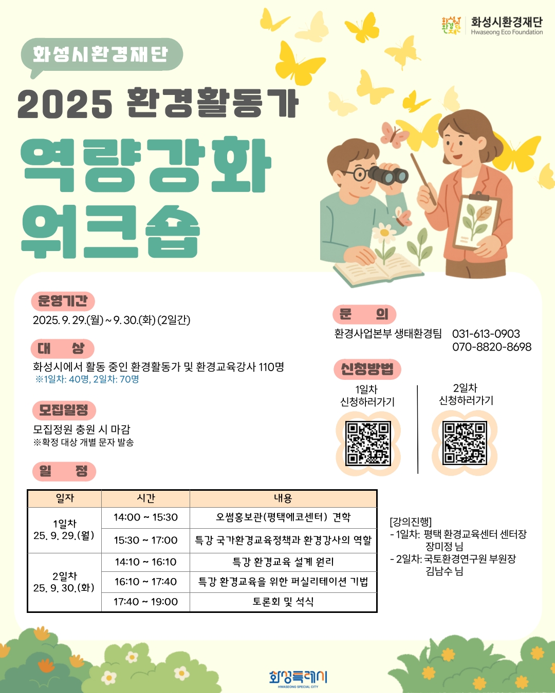 「화성시환경재단 2025년 환경활동가 역량강화 워크숍」 참여자 모집 ★ 화성시에서 활동 중인 환경 활동가 및 환경교육강사들을 대상으로 역량강화 프로그램을 진행합니다 ! :) ◆ 일정 : 2025. 9. 29. (월) ~ 9. 30.(화) 2일간 - 1일차: 13:30 ~ 17:00 - 2일차: 14:00 ~19:00 ◆ 내용: 현장형 선진지 견학 및 특강 중심의 역량 강화 프로그램 ◆ 장소: - 1일차: 오썸플렉스 홍보관 및 평택환경교육센터 - 2일차: 푸르미르 호텔 (사파이어홀, 화성시 효행로 480) ◆ 모집인원: 1일차-40명, 2일차-70명 (선발자 개별 연락) ◆ 모집기간: ~ 정원 마감 시까지 지속 ◆ 신청방법: - 1일차: 네이버 폼 (https://naver.me/5NMeFlS4) 작성 - 2일차: 화성시통합예약시스템(https://m.site.naver.com/1R8D7) 신청 환경에 관심 있는 많은 분들의 참여 부탁드립니다. ^_^! |