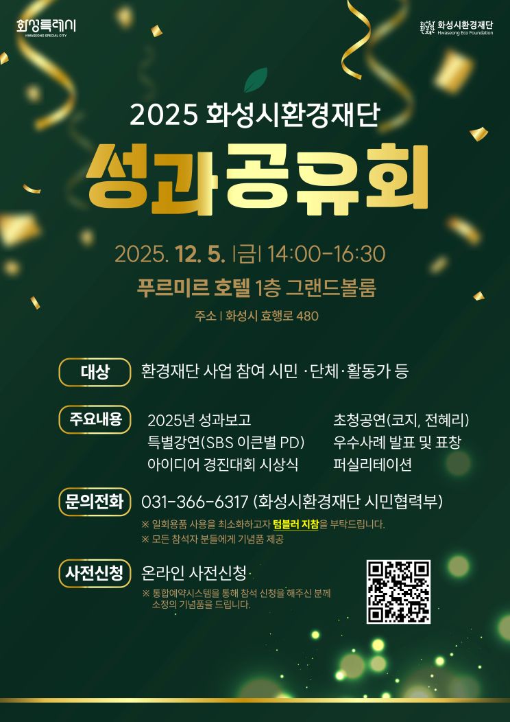 올 한 해, 시민과 함께 만든 환경 변화의 순간들을 한자리에! 2025 화성시환경재단 성과공유회에 초대합니다. ■ 행사개요 ○ 행 사 명 : 2025년 화성시환경재단 성과공유회 ○ 행사일시 : 2025. 12. 5.(금) 14:00 ○ 행사장소 : 푸르미르 호텔 그랜드볼룸(대연회장) ※화성시 효행로 480 ○ 참여대상 : 2025년 화성시환경재단 사업 참여 시민·단체·활동가 등 시민 누구나 ○ 참여방법 : 화성시통합예약시스템(http://m.site.naver.com/1TuTS)(포스터 QR) ○ 문의사항 : 031-366-6317