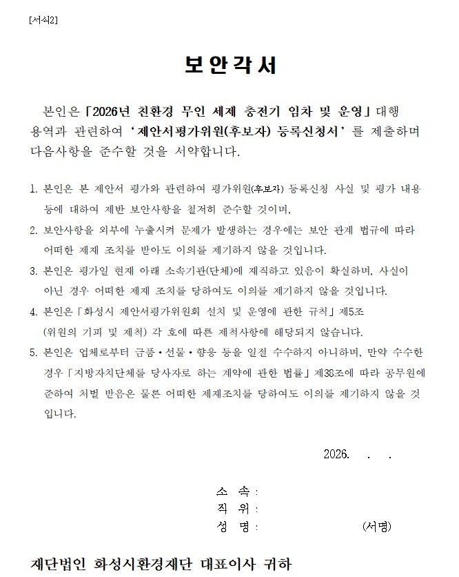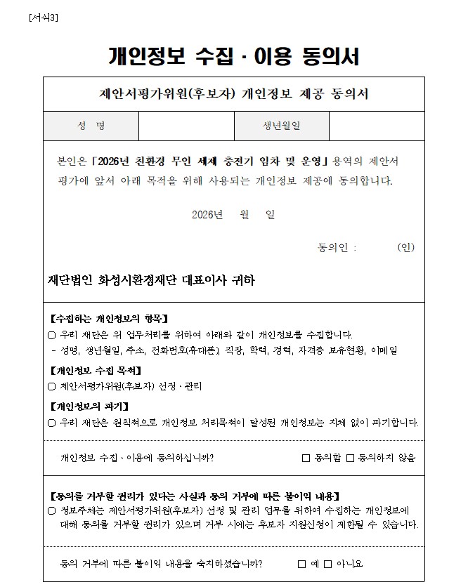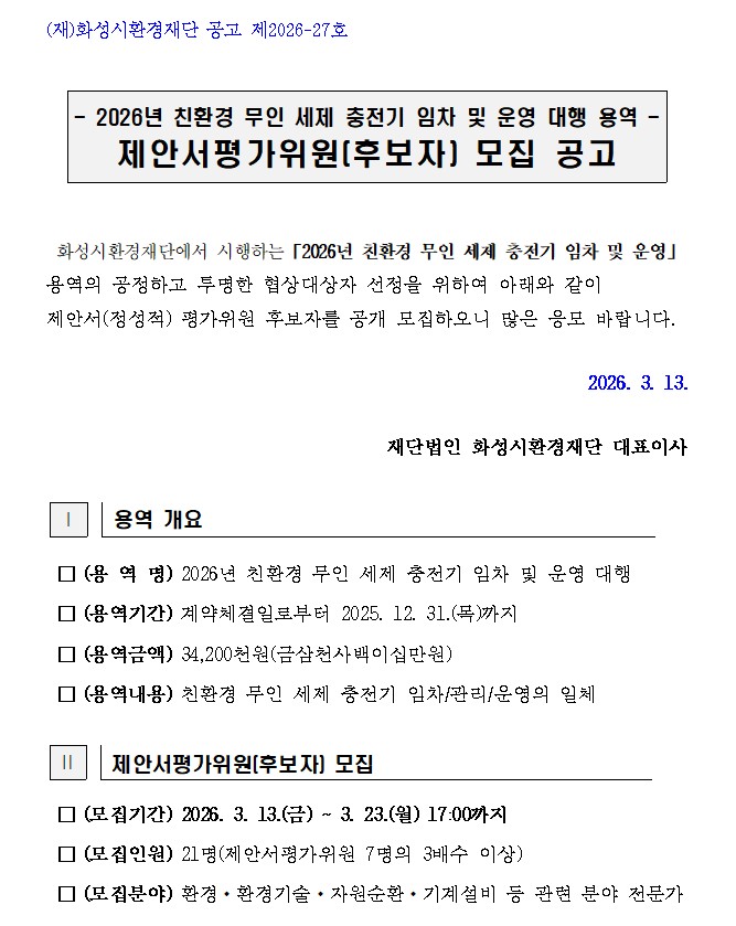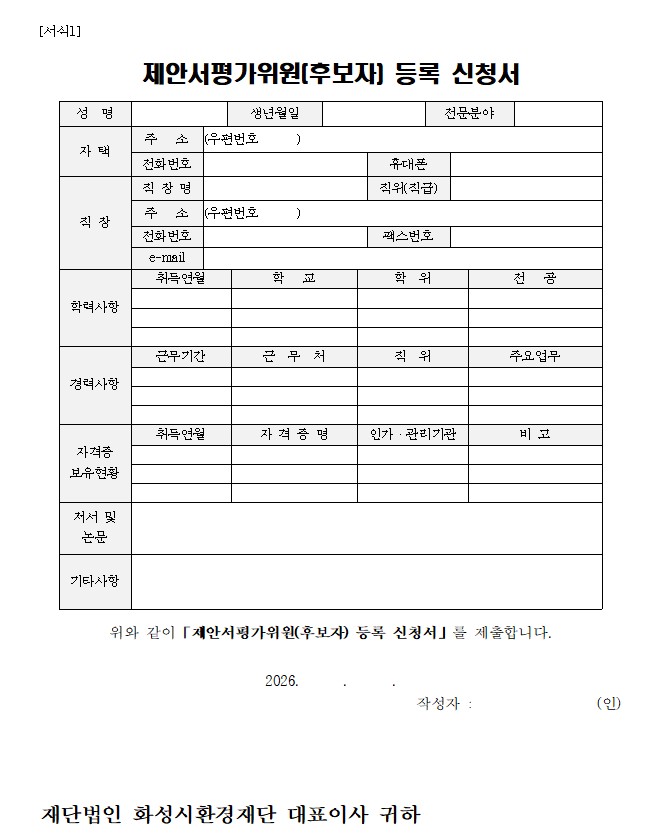 [서식 1] 제안서평가위원회(후보자) 등록 신청서 [서식 2] 보안각서 [서식 3] 개인정보 수집 이용 동의서 * 하기 일정은 재단 상황에 따라 변동될 수 있습니다. □ 제안서평가위원회 모집 ○ 모집기간 : 2026. 3. 13.(금) ~ 3. 23.(월) 17:00 ○ 모집인원 : 총 21명 ○ 접수방법 : 이메일 제출(cksgh12@hsef.or.kr) ○ 문의사항 : ☎ 031-366-5087 □ 제안서평가위원회 개최 ○ 개최일시 : 2026. 3. 27.(금) 14:00 예정 ○ 개최장소 : 동탄구 다원이음터(동탄순환대로 754-14)