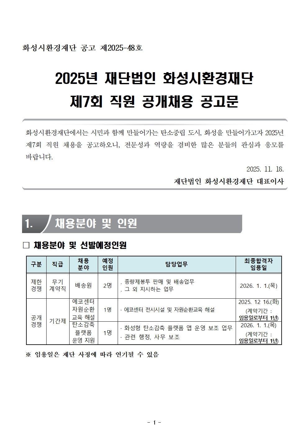 2025년 재단법인 화성시환경재단 제7회 직원 공개채용 공고